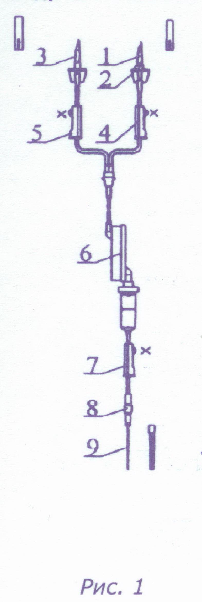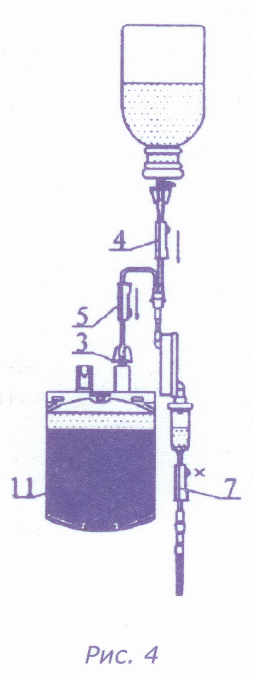 - При подключении другого контейнера с трансфузионной средой закройте зажим 7, не извлекая инъекционную иглу из вены, и, не допуская опорожнения трубки с полимерной иглой 3, извлеките последнюю из контейнера 11 и быстро введите ее в контейнер, наполненный трансфузионной средой.