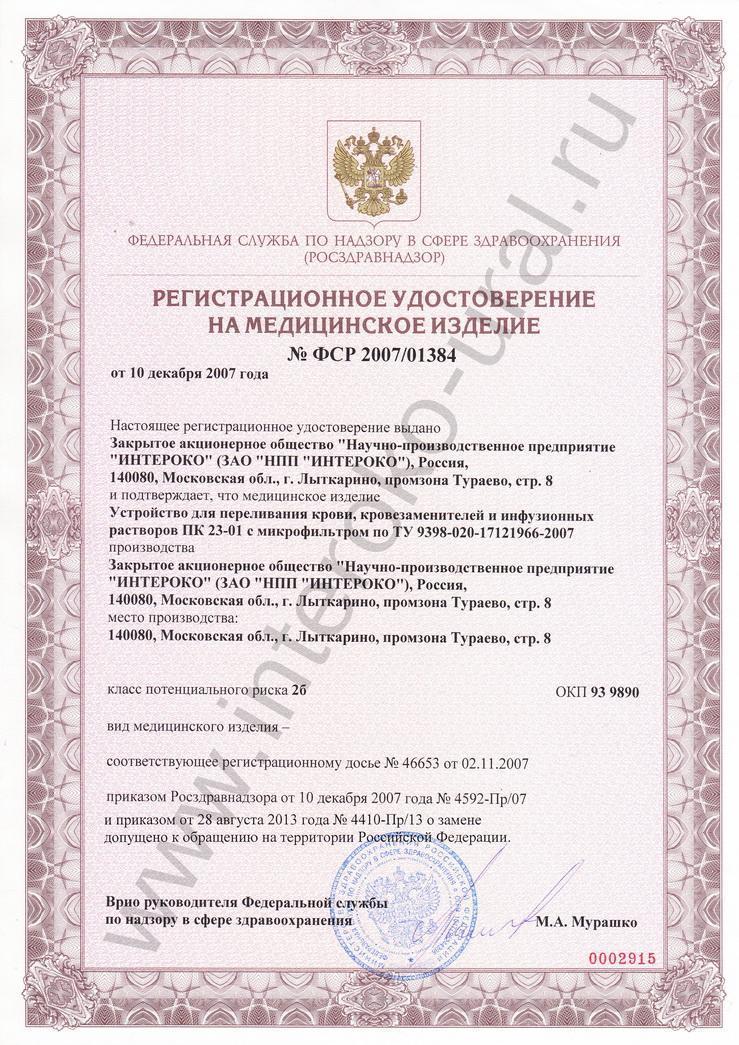 Устройство для переливания крови с микрофильтром однократного применения, стерильное ПК 23-01 «ИНТЕРОКО» ТУ 9398-020-17121966-2007