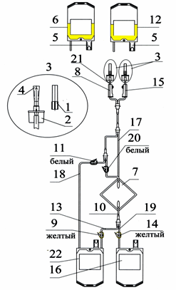 10. Для вытеснения воздуха из контейнера 22 расположите его в плазмоэкстракторе, откройте белый зажим 11 и роликовый зажим 8. С помощью плазмоэкстрактора аккуратно надавите на контейнер 22 с отфильтрованной плазмой, не допуская попадания плазмы в трубку 18, переведите воздух в контейнер 6, закройте зажим 11.