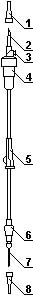 | Проверьте целостность потребительской тары и срок годности устройства. Вскройте потребительскую тару и извлеките устройство. Снимите колпачок 1 с полимерной иглы 2 и введите ее в штуцер контейнера или пробку бутылки с трансфузионной средой. Закройте зажим 5. Переверните емкость и закрепите ее на штативе. Заполните капельницу до половины объема, сдавливая ее корпус 4. Снимите колпачок 8 с инъекционной иглы 7. Откройте клапан 3 воздуховода (при переливании из контейнера клапан 3 не открывать!). Откройте зажим 5 и заполните устройство до полного вытеснения воздуха. Закройте зажим 5. Произведите венепункцию инъекционной иглой 7. Откройте зажим 5 и с его помощью отрегулируйте скорость трансфузии. Вводите дополнительные медикаменты шприцом с иглой диаметром не более 0,8 мм через инъекционный узел 6, предварительно закрыв зажим 5. При смене емкости закройте зажим 5, клапан 3. Не извлекайте инъекционную иглу из вены и не допускайте опорожнения капельницы 4, извлеките полимерную иглу 2 из опорожненной емкости и быстро введите ее в наполненную. |