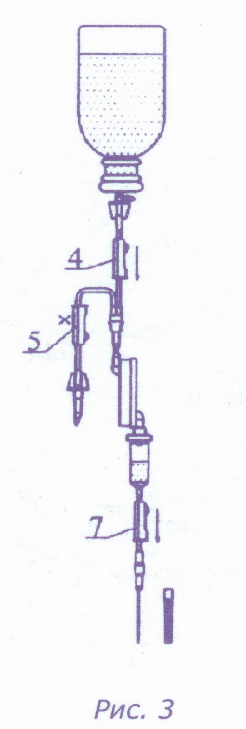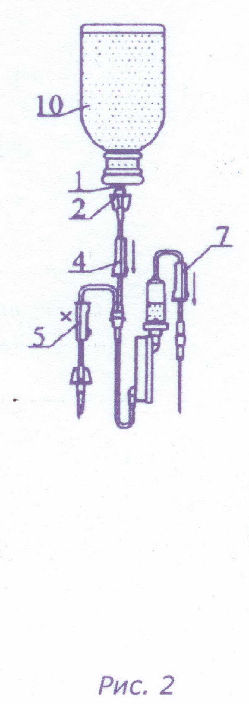 - При подключении другого контейнера с трансфузионной средой закройте зажим 7, не извлекая инъекционную иглу из вены, и, не допуская опорожнения трубки с полимерной иглой 3, извлеките последнюю из контейнера 11 и быстро введите ее в контейнер, наполненный трансфузионной средой.