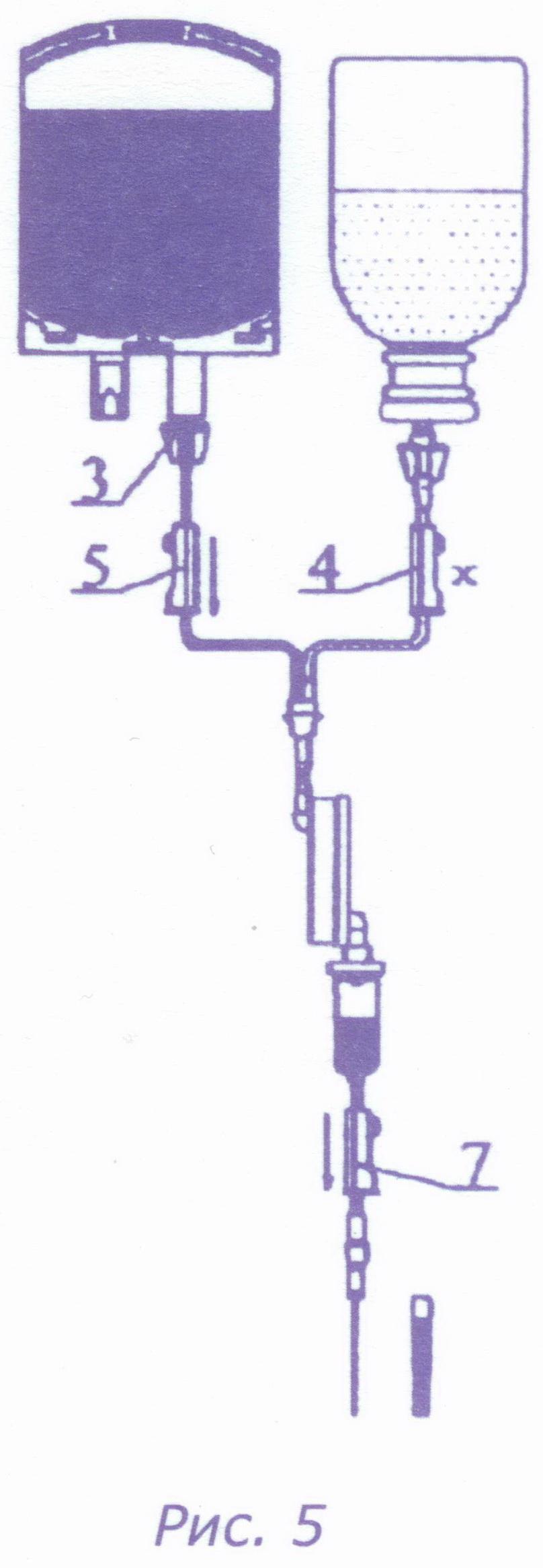 При использовании в качестве трансфузионной среды эритроцитной массы или эритровзвеси, откройте зажим 5 и добавьте 100…150 мл изотонического раствора в соответствии с действующей инструкцией по переливанию крови и ее компонентов. Количество переливаемого изотонического раствора контролируйте по меткам на контейнере или бутылке.