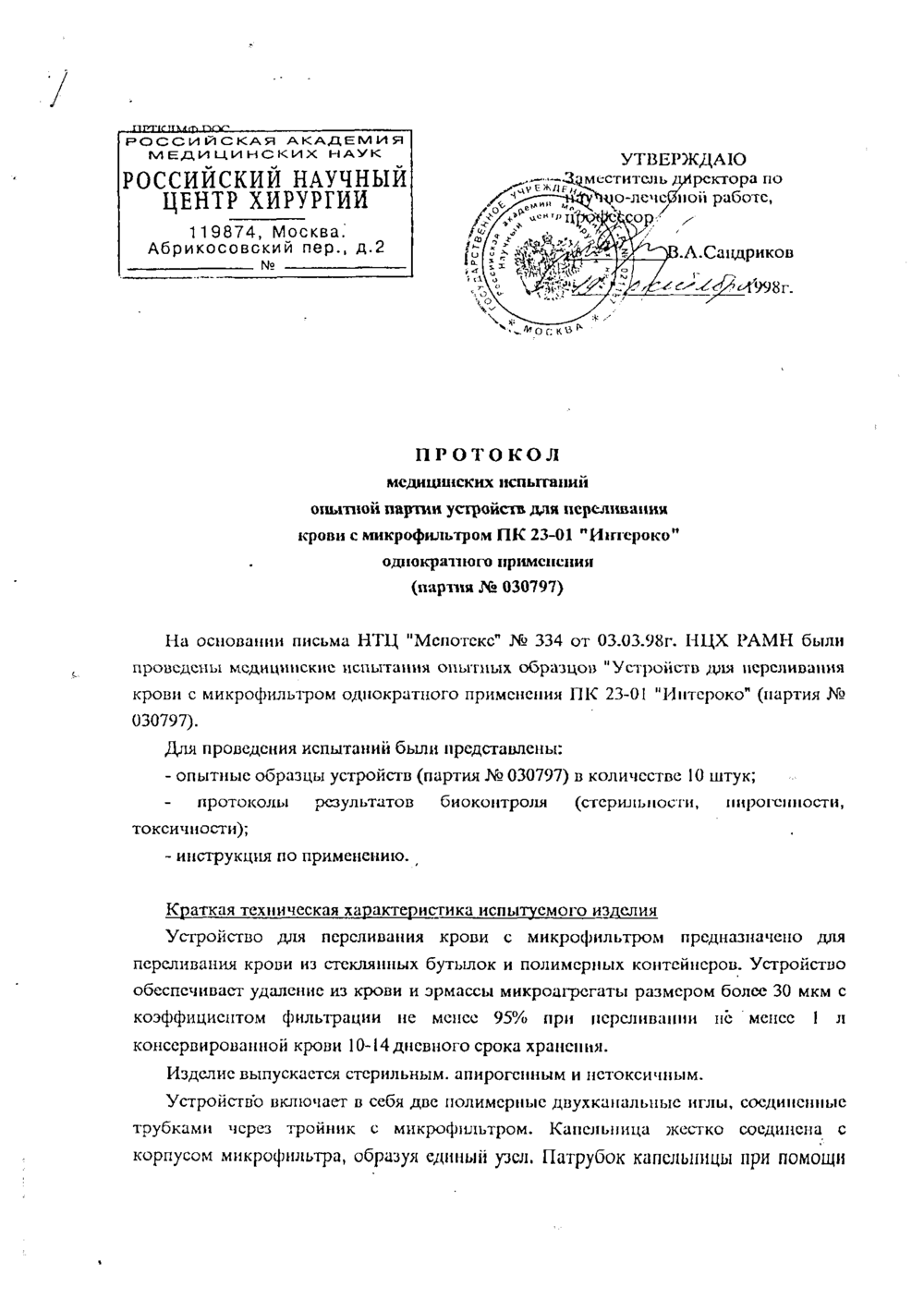Полностью соответствует медицинским требованиям и рекомендациям к применению в медицинской практике. Предназначено для работы в условиях клинических подразделений различного профиля, активно использующих гемотрансфузионные методы терапии как с аллогенной, так и аутологичной кровью. Устройство ПК 23-01 с микрофильтром апробировано в ведущих клинических учреждениях страны (Российский научный центр хирургии РАМН, Гематологический научный центр РАМН, Главный военный клинический госпиталь им. Н. Н. Бурденко и др.).